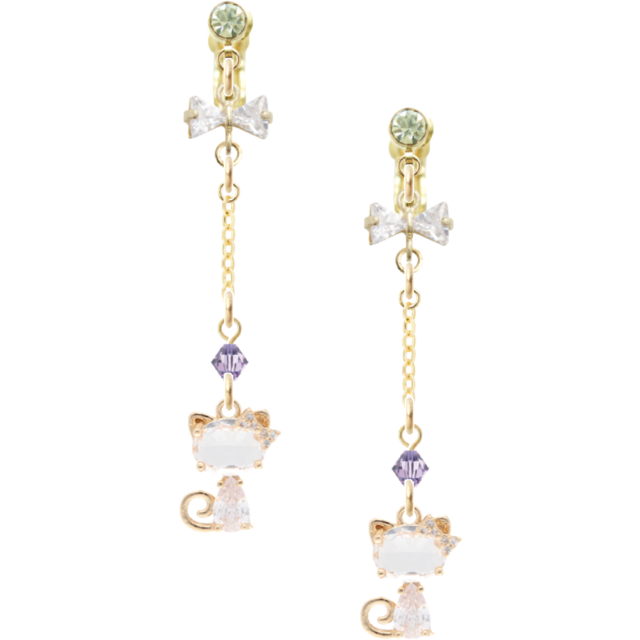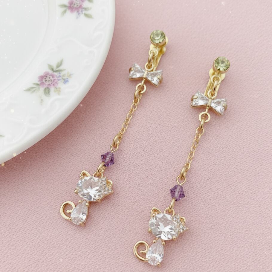 キラキラリボンとジルコニアのにゃんこチャームイヤリング バイオレット
