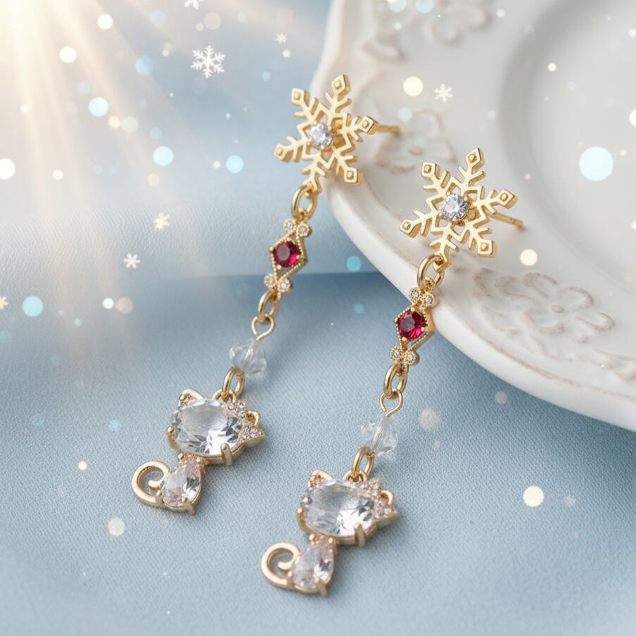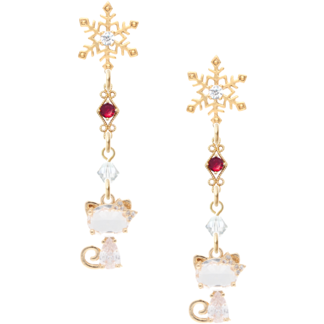 雪の結晶モチーフとジルコニアのぷっくり猫チャームのピアス レッド×ムーンライト