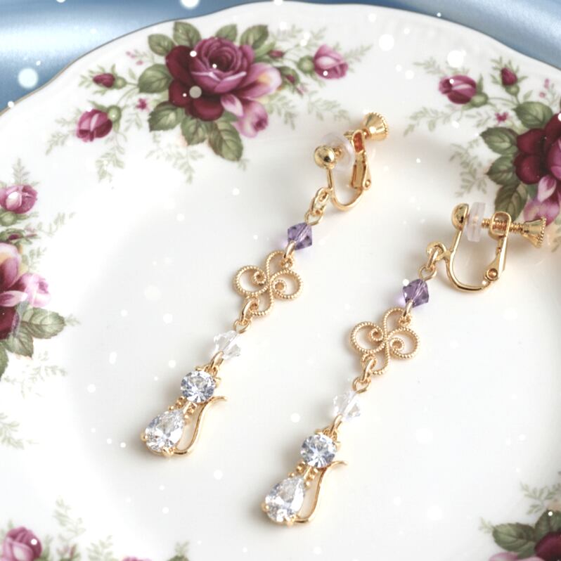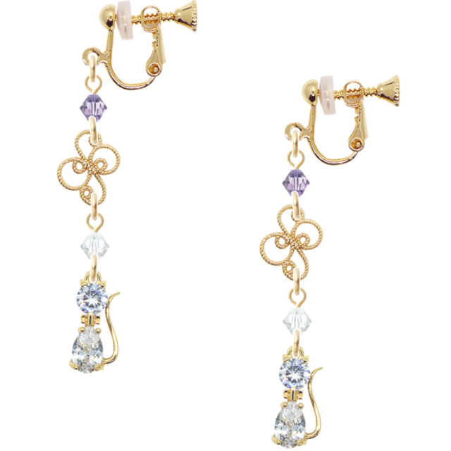 雪の調べをまとう猫のイヤリング ― ヴァイオレットの光(16金メッキ)
