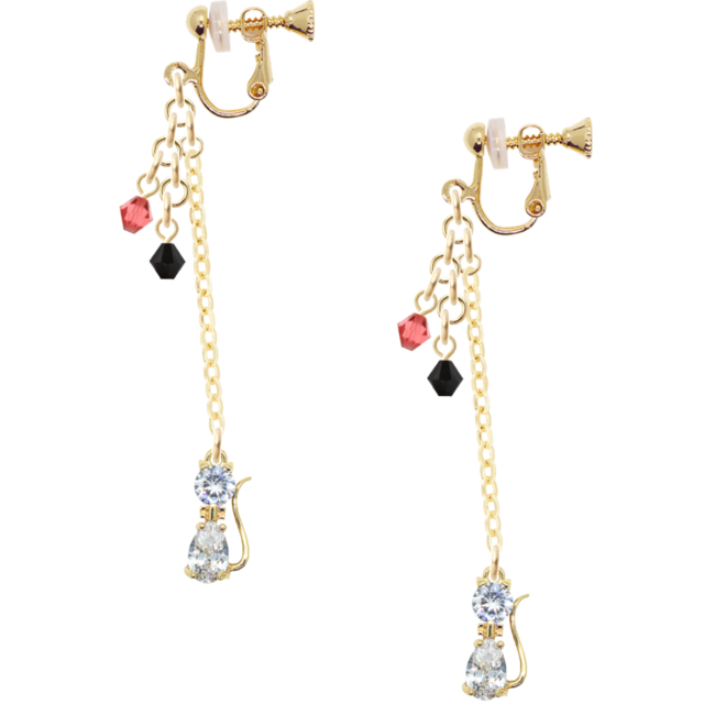 光と影をまとう猫のイヤリング(16金メッキ/スワロフスキー パパラチア&ジェット)