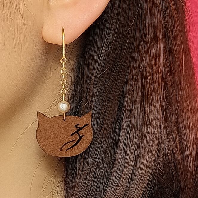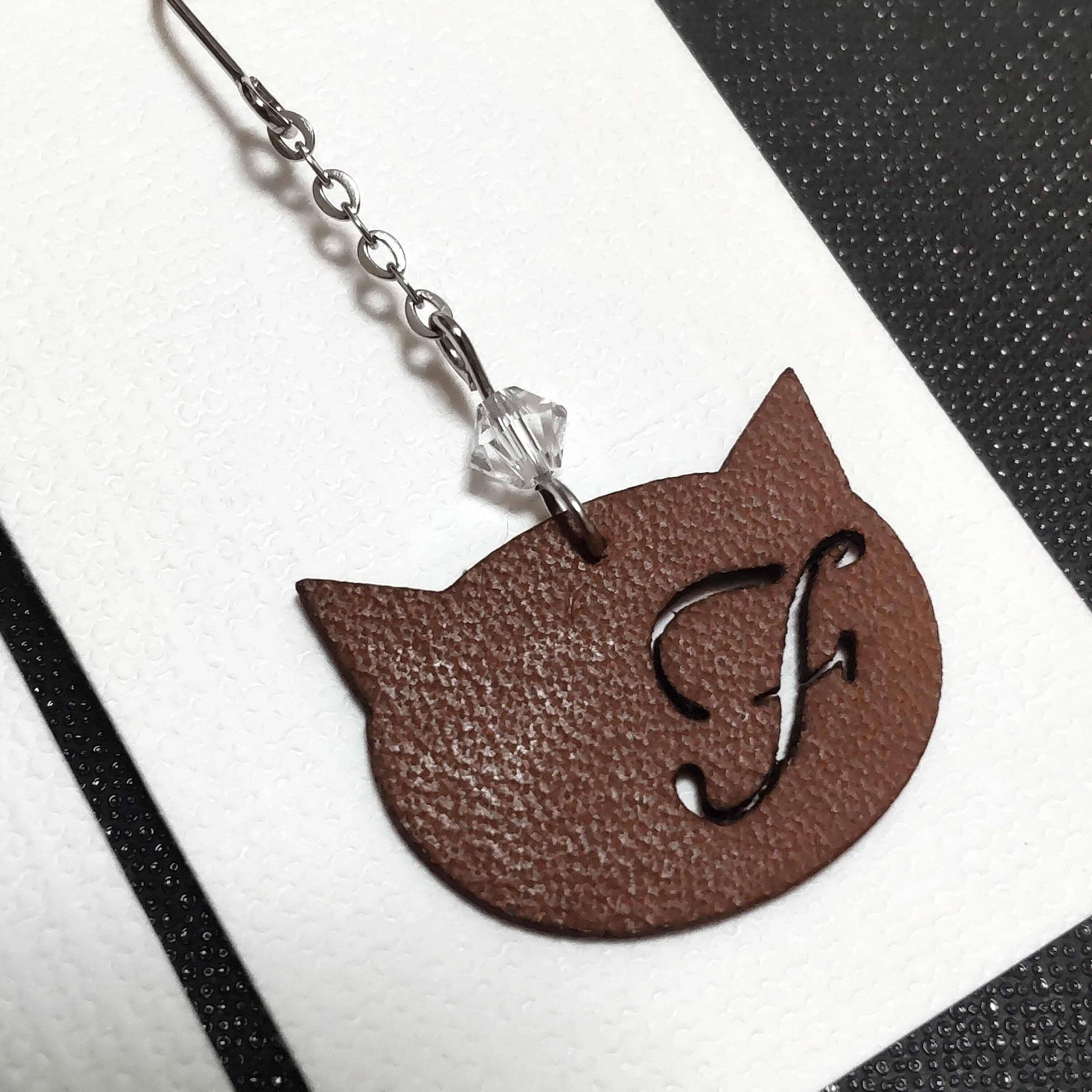 耳元で軽やかに揺れるレザーの猫シルエットには、オリジナルデザインのアルファベットのイニシャルを刻印。
