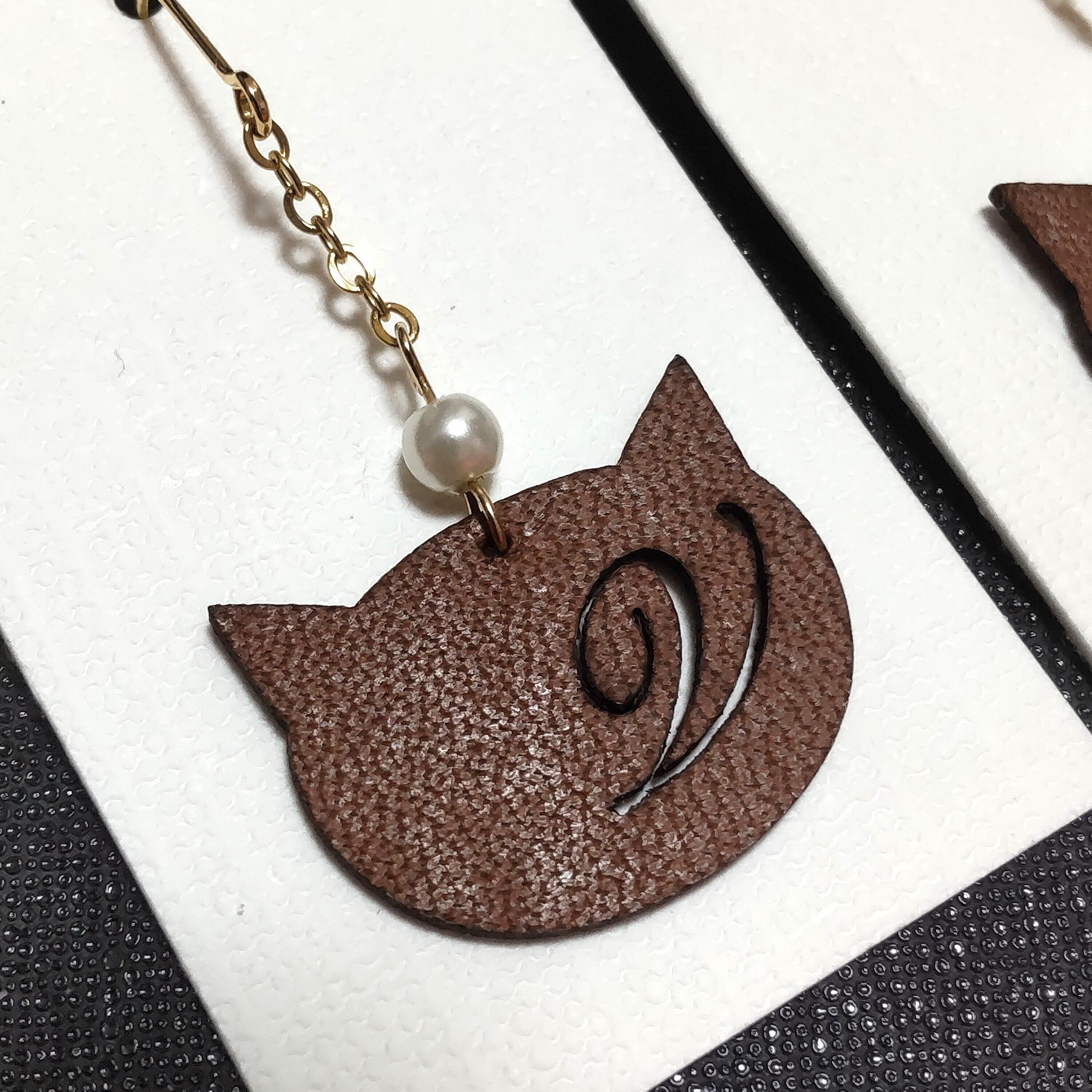 イニシャル入り本革レザーキャットピアス|猫モチーフ × パール × シンプルモードデザイン 濃茶ブラウン