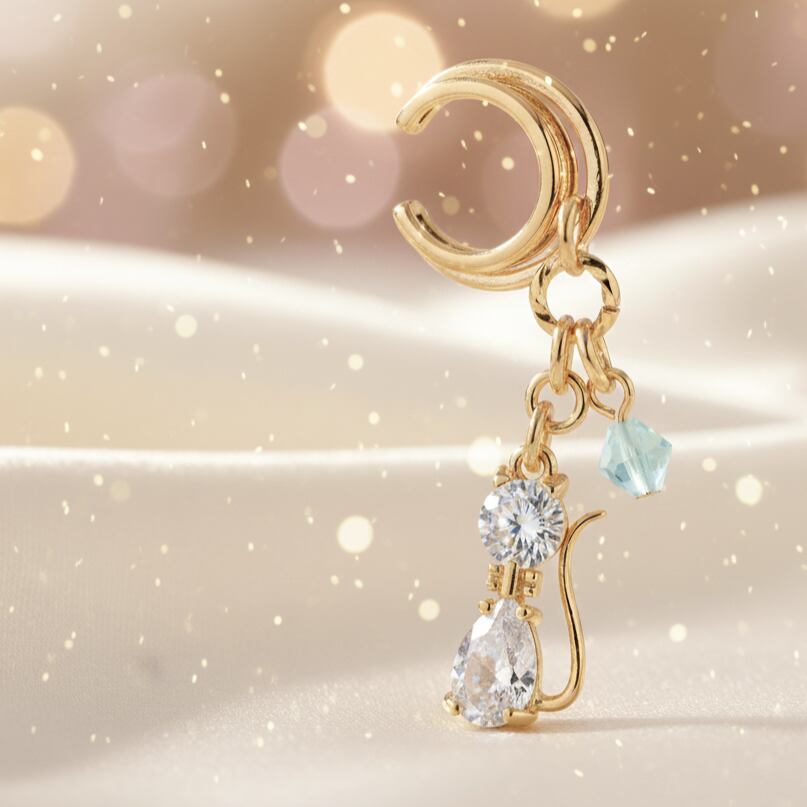 上品な猫のCZチャームが寄り添う、透明感あふれるイヤカフです。