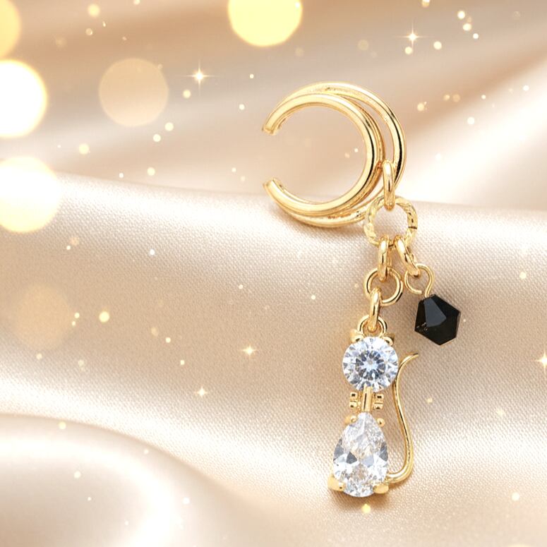 月影の猫のイヤカフ(2連デザイン/スワロフスキー ジェット)