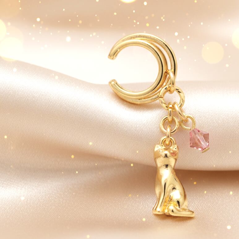 立体的な猫モチーフが上品にきらめき、優しさと遊び心を添えます。