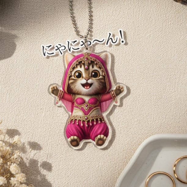 見ているだけでハッピーになる、ベリーダンス風のキュートな衣装をまとった子猫のアクリルキーホルダーが登場!「にゃににゃ〜ん!」という元気な鳴き声が今にも聞こえてきそうな、愛らしい表情とポーズが魅力です。